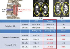 서울대병원, 서울아산병원 등 전국 8개 의료기관에서 척추질환이 있는 환자 100명을 대상으로 후외방 요추유합술 임상시험을 통한 12개월 CT결과 골이식시 gold standard인 자가장골(대조군)에 비해 노보시스 군 100%, 자가장골 이식군 90.2%, 24주 CT결과 노보시스군 100%, 자가장골 이식군 94.1% 유합율을 보여 골유합율에서 자가골보다 높은 골유합을 확인하였다.