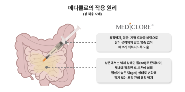메디클로는 상온에서는 액체 상태인 졸(sol)로 존재하다가 체내에 적용된 후 체온에 의해 점성이 높은 겔(gel) 상태로 변화해, 수술 후 유착이 예상되는 부위에서 쉽게 떨어지지 않아 상처가 회복되는 동안 유착이 형성되는 것을 효과적으로 방지하는 것이 특징이다.