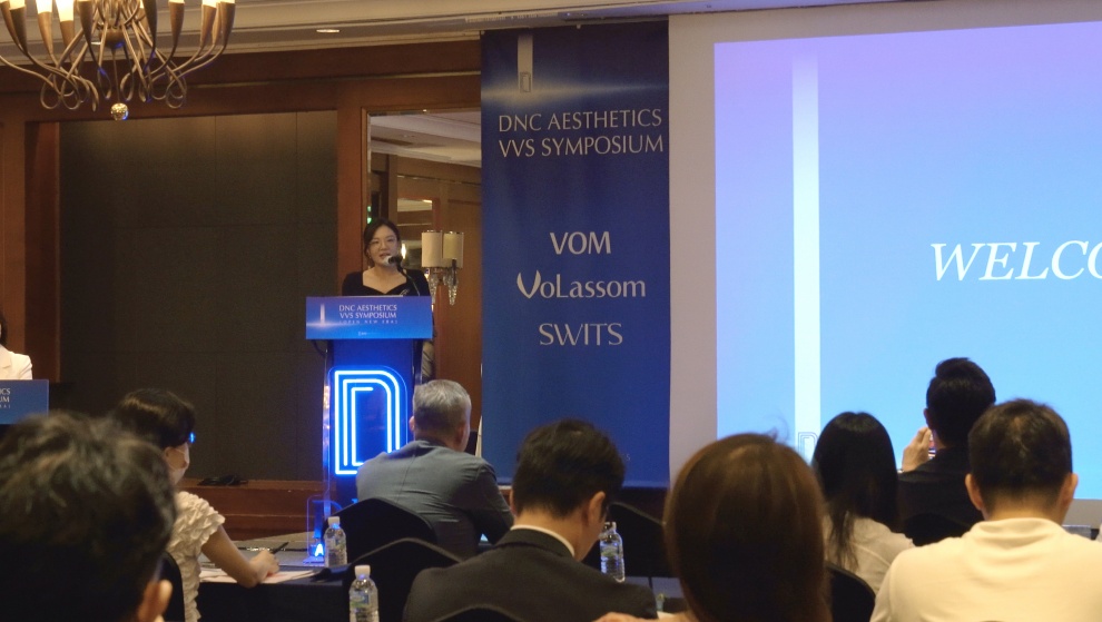 ▲ DNC 에스테틱 VVS 심포지엄에서 정주미 디엔씨 본부장이 환영사를 하고 있다.