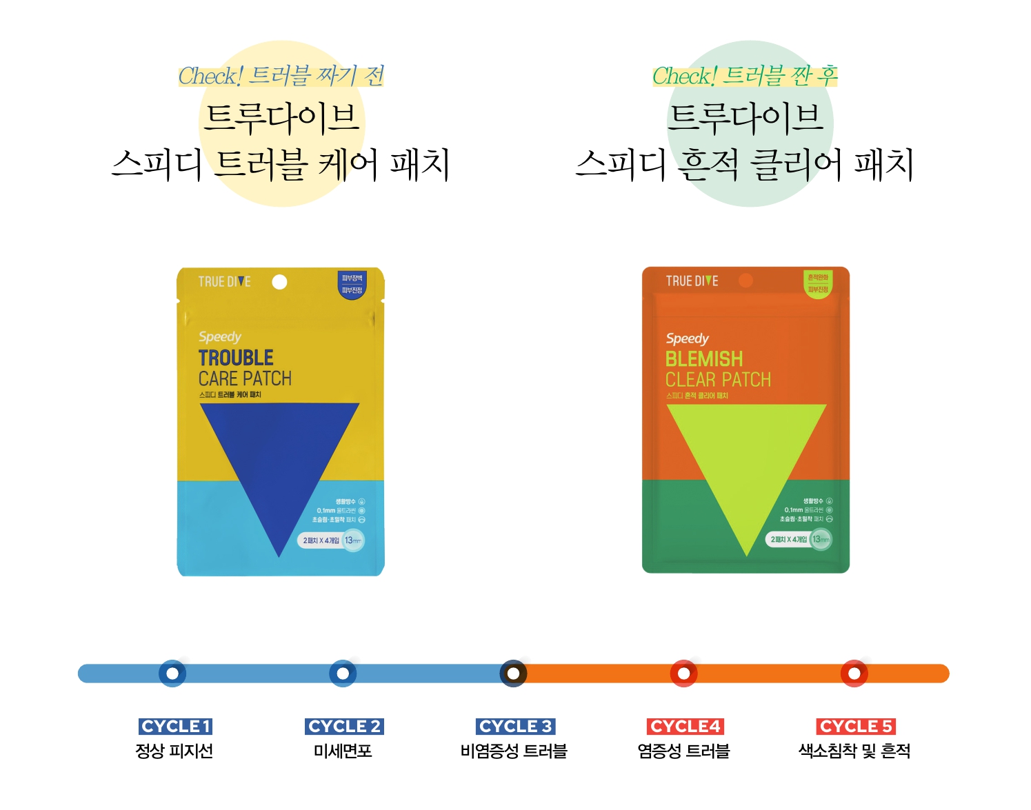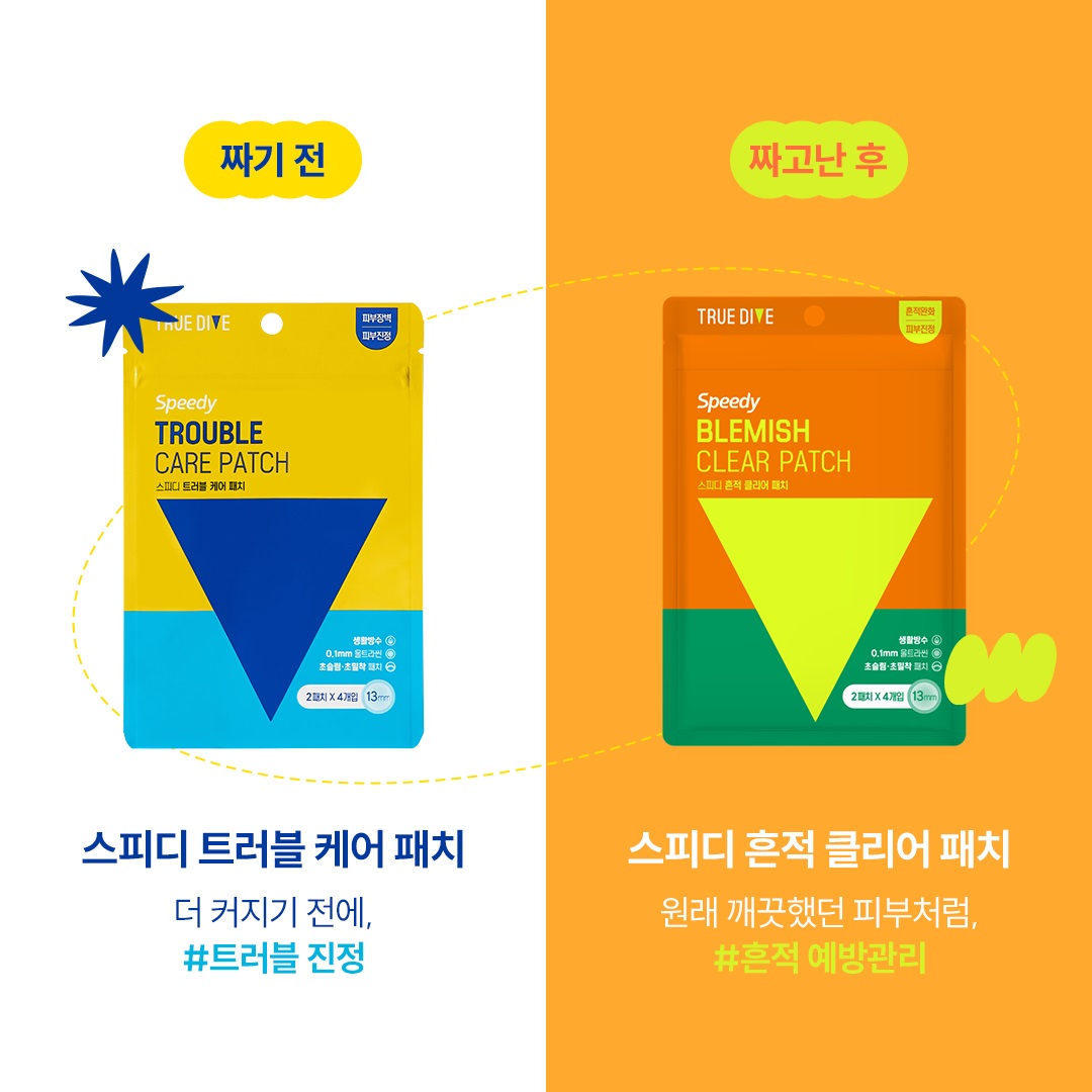 ▲ (왼쪽부터)트루다이브 스피디 ‘트러블 케어 패치’와 트루다이브 스피디 ‘흔적 클리어 패치’ 제품 이미지