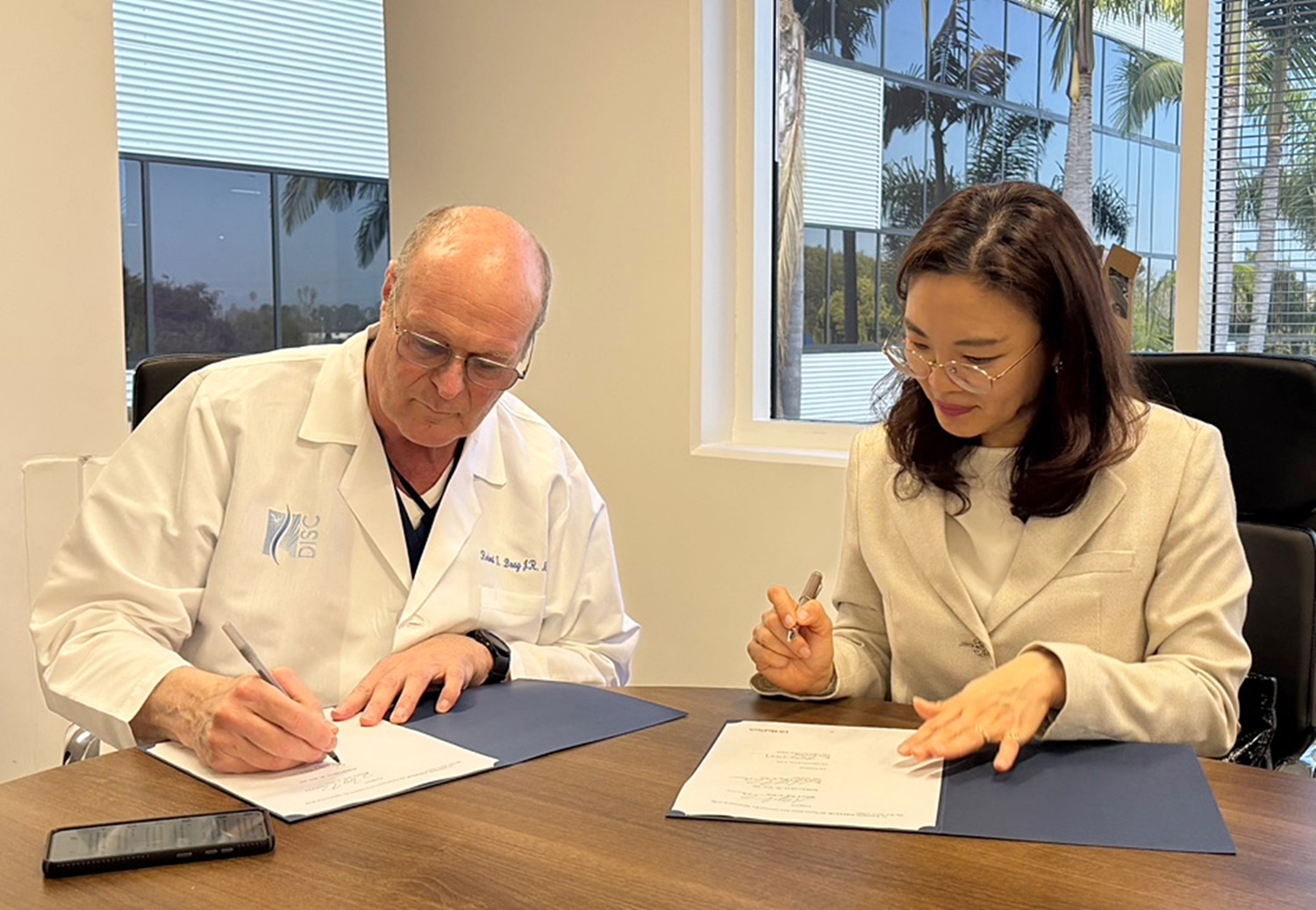 ▲ [사진자료2] 정주미 시지메드텍 대표(오른쪽)와 로버트 브레이 주니어 박사(Robert S. Bray, Jr.)가 최소 침습 척추 수술 기술 협력을 위한 계약서에 서명하고 있다.