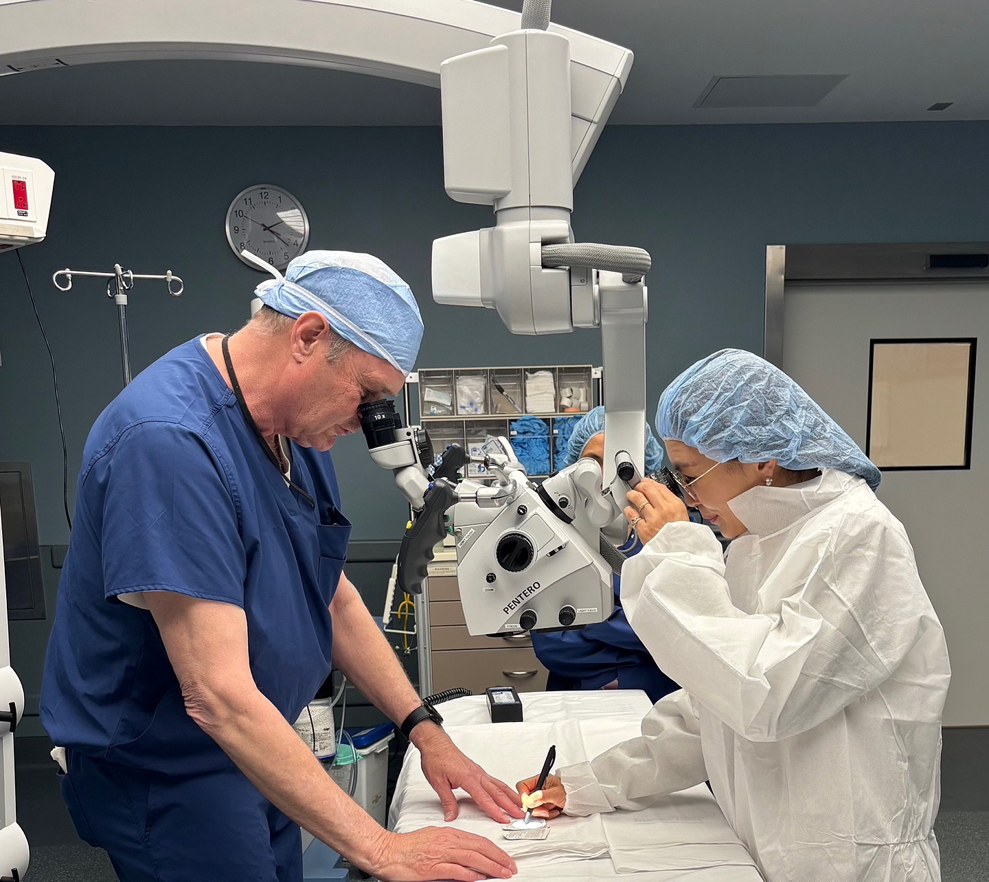 ▲ [사진자료4] 로버트 브레이 주니어 박사(왼쪽)가 정주미 시지메드텍 대표에게 최소침습 척추수술에 사용되는 미세 현미경에 대해 설명하고 있다.