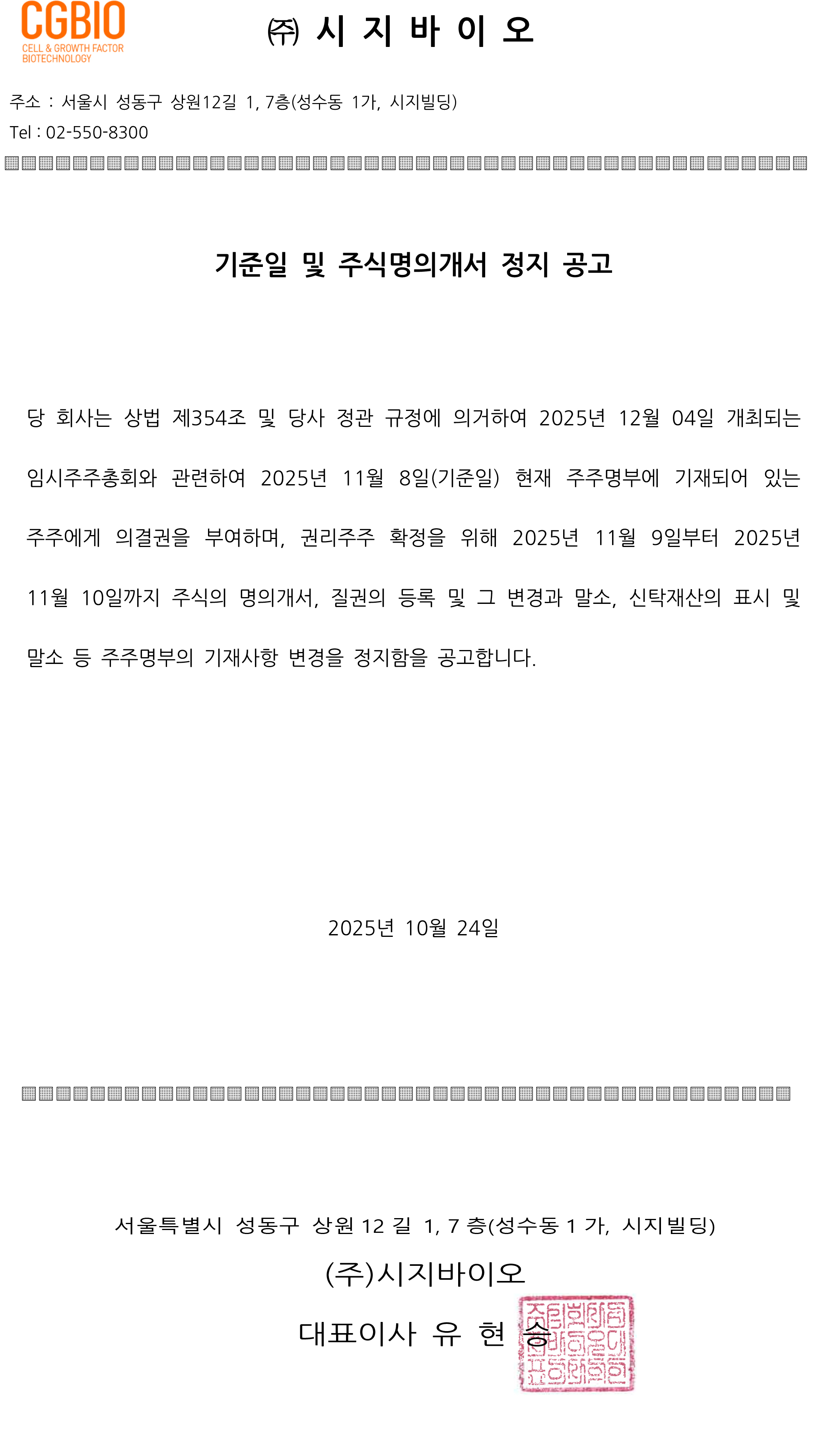 주주총회 소집 기준일 공고문 2025-10-24 cgbio 조회수Views : 312 다음글시지바이오, ‘발리 밋 더 마스터 2025’ 성료…23개국 의료진과 ‘교육-술기전파-임상연구’ 잇는 K-에스테틱 글로벌 생태계 구축 이전글시지바이오, 장기 지속형 약물전달 플랫폼 공동개발…환자 편의성 높인다