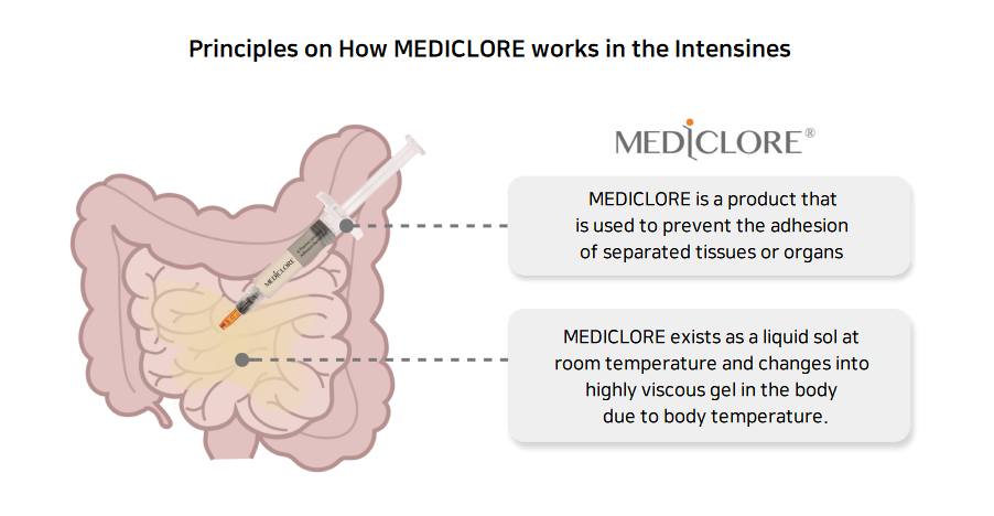 MEDICLORE exists as a liquid sol at normal temperatures and changes to a highly viscous gel due to body temperature. It is characterized by its ability to effectively prevent adhesion from occurring while the wound heals because it does not easily slip from the area where adhesion is expected following surgery.
