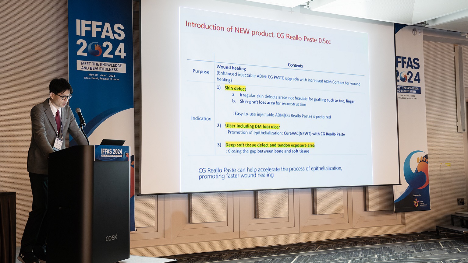 First, Professor Kwang-hwan Park from Severance Hospital shared his clinical experience using these products in diabetic foot surgery under the theme ‘Use of CGDerm Matrix and CG Reallo Paste in Foot Wounds’. CGDerm Matrix is an acellular allogeneic dermis in sheet form that engrafts quickly and does not contract.