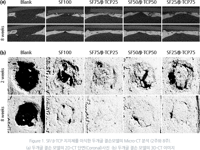 본 연구결과에서, SF/β-TCP 지지체가 골 조직 공학에 사용되기 위한 높은 기계적 강도와 적절한 다공성을 가지고 있음을 확인하였으며, SF/β-TCP(75:25) 지지체가 다른 비율의 지지체와 비교하여 가장 높은 골 형성을 보였다.