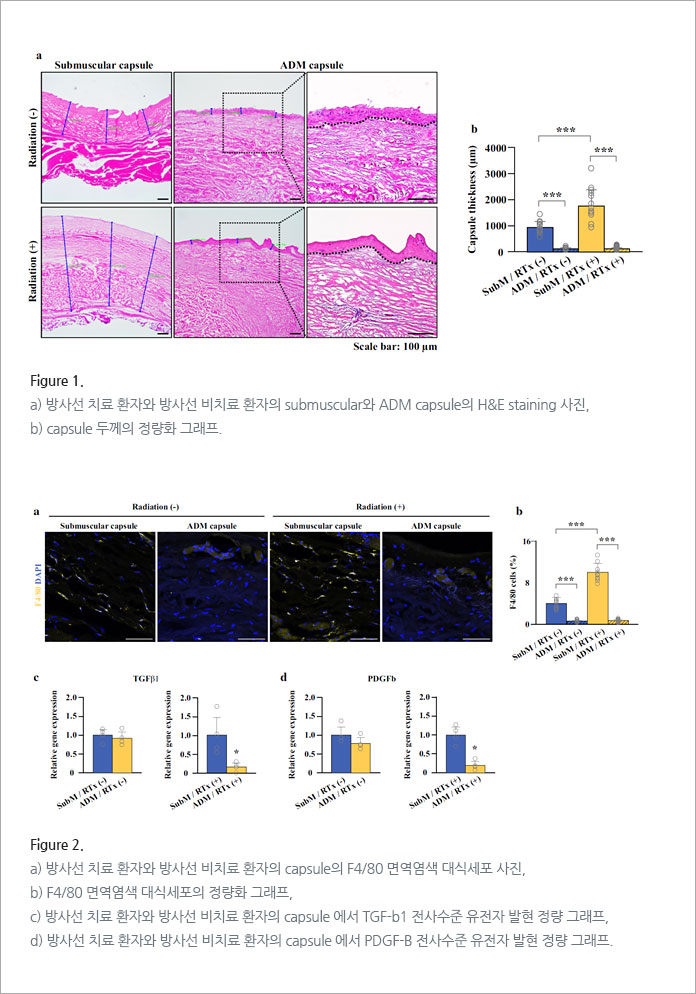 보형물 기반 2단계 즉시 유방재건을 받은 총 30명의 환자가 연구에 참여하였고 그 중 15명은 방사선 치료를 받았다. 이들 환자에서 조직확장기를 영구보형물로 교체하는 동안 subpectoral capsule과 ADM(CGcryoderm) capsule의 생검을 실시하였다. 생검 조직으로부터 캡슐의 두께, 조직면역학 염색(a-smooth muscle actin;a-SMA, vimentin, CD31, F4/80(macrophage marker), a-SMA와 CD31의 중발현(coexpression)), 상대적 유전자 발현량(transforming growth factor (TGF)-b1, platelet-derived growth factor (PDGF)-B)을 확인하였다.