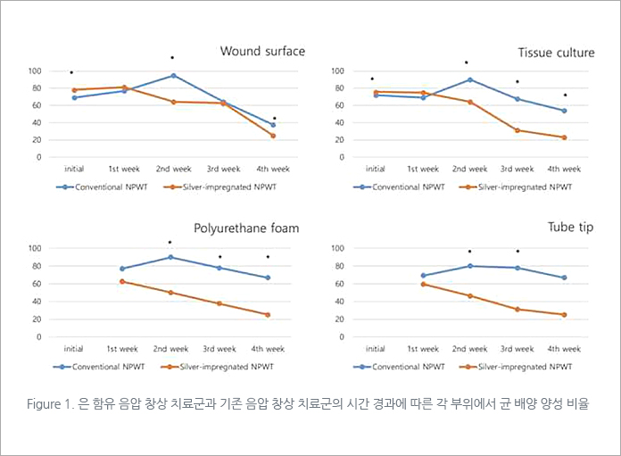 은 함유 음압 창상 치료를 적용 받은 군의 균 발생율이 기존 음압 창상 치료를 받은 군보다 낮았으며 균의 증가속도 역시 낮게 나타났다. 4주 간의 관찰 결과, 은 함유 음압 창상 치료가 창상에서의 균 군집 형성을 효과적으로 억제하는 것을 확인하였다.