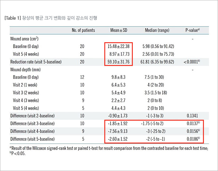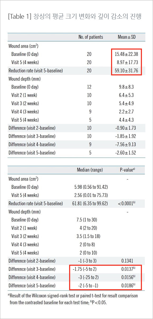 연구에 참여한 20명의 평균 연령은 61.5세였으며 남성이 14명, 여성이 6명이었다. 4주 후 환자들의 창상 크기는 8.97±17.73㎠으로 치료 전 15.48±22.38㎠과 비교해 약 59% 감소한 것으로 관찰되었다(p <0.0001). 창상 깊이의 경우 치료 2주 후부터 유의하게 감소하여 4주 후에는 창상 깊이 측정이 가능한 환자는 5명에 불과했다. 완전히 회복된 환자의 비율은 75%(15명)로 13명은 창상이 봉합되었으며, 2명의 경우 육아조직이 재생되어 추가적인 이식 수술이 가능한 상태로 호전된 것을 확인하였다. 감염이나 혈종, 장액종의 발생은 관찰되지 않았다.