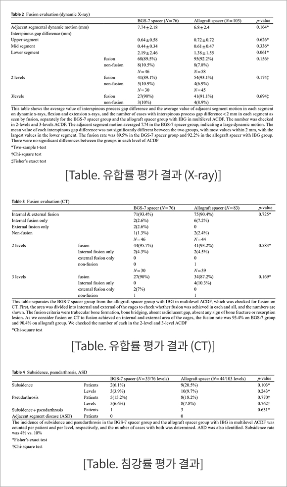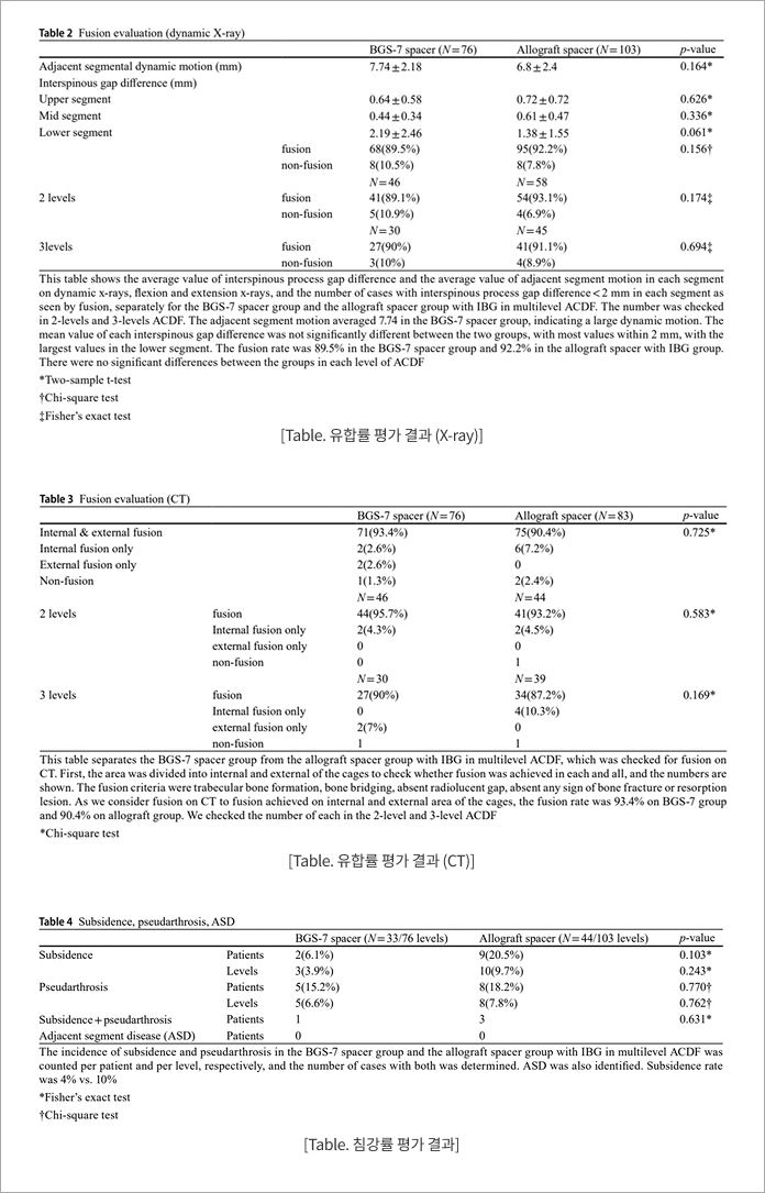 수술 1년 후 유합률은 BGS-7 그룹에서 89.5%, 동종골 그룹에서 92.2%로 유의한 차이가 없었으며, 내부 및 외부 골유합 비율도 각각 93.4%와 90.4%로 유의한 차이가 없었다. 또한, BGS-7 그룹은 동종골 그룹과 비교하여 침강률과 케이지 파손률이 적었으며, 하부 분절 높이가 잘 유지되었다. JOA, NDI, FRI, VAS 등의 임상적 평가지표에서는 두 그룹 모두 수술 전과 비교하여 유의하게 개선된 결과를 보여주었다.