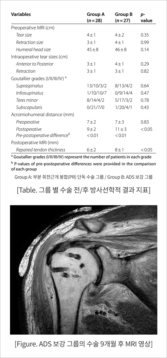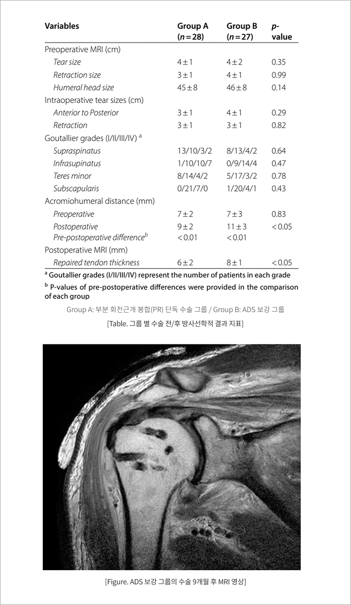 회전근개 봉합 단독 수술그룹과 ADS보강 그룹을 각각 평균 40개월, 36개월 추적 관찰한 결과, 유의적인 임상적 개선을 확인하였다 (VAS, UCLA, Constant-Murley). 특히 MRI 및 초음파 분석 시 ADS보강 그룹의 힘줄 두께가 회전근개 봉합 단독 수술그룹 보다 더 두꺼웠고 (8±1 mm vs 6±2 mm), p<0.05), 상완-견봉간 거리(AHD) 역시 더 큰 증가폭으로 나타났다 (7 mm→ 11 mm vs 7 mm → 9 mm, p<0.01). 재파열은 회전근개 봉합 단독 수술그룹에서 9건이 발생한 반면, ADS보강그룹은 4건만 확인됨으로써 ADS 보강 그룹에서 더욱 개선된 수술 예후를 확인하였다.