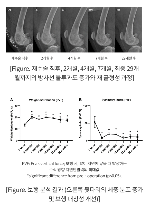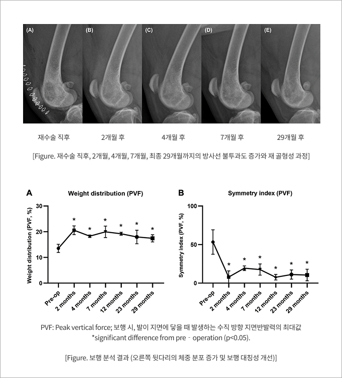 골든 리트리버는 재수술 후 2개월 시점에서 정상 보행을 회복하였으며, 보행 분석에서도 체중 분포와 대칭성이 유의하게 개선되었다. 방사선 추적 검사에서는 수술 직후 투과성이었던 병변 부위가 점진적으로 불투과성을 회복하며 재 골형성을 보였고, 최종 29개월 추적 시점까지 재발은 관찰되지 않았다. BMP-2 사용과 관련된 부작용(연부조직 부종, 이소성 골형성 등)은 없었으며, 임상적으로도 장기간 무증상 상태가 유지되었다.