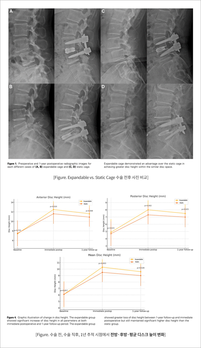 Ref) Dongkyu Kim, Hyun Jun Jang, Bong Ju Moon, Kyung Hyun Kim, Sung Uk Kuh, Dong Kyu Chin, Keun Su Kim, Jeong Yoon Park. Expandable Cage in Minimally Invasive Transforaminal Lumbar Interbody Fusion: Comparative Data with Static Cage from a Single Institution and a Single Surgeon. World Neurosurgery, 2025; 202:124428
